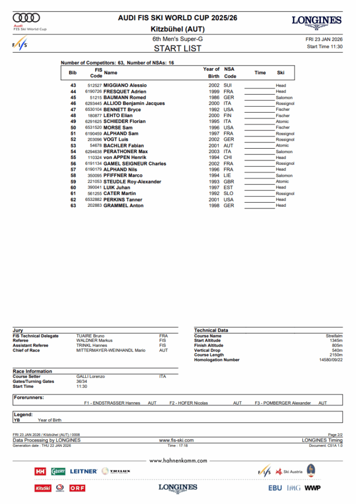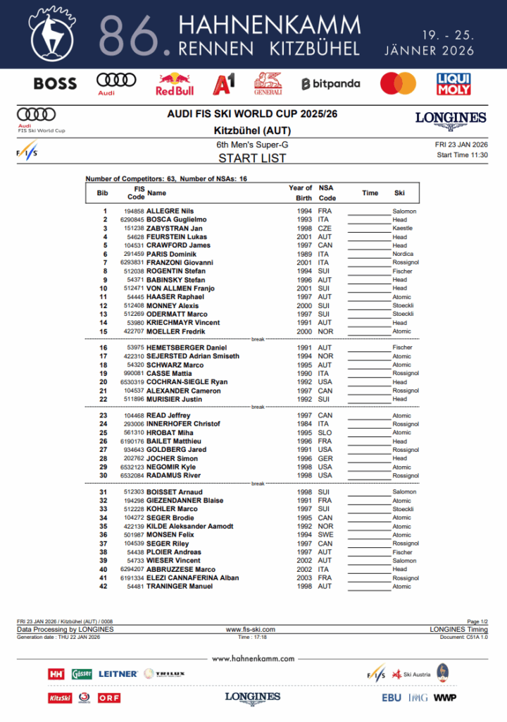The lads’s Alpine World Cup pace subject returns to Kitzbühel on Friday for the sixth males’s super-G of the 2025–26 season, racing on the Streifalm as a part of the Hahnenkamm program. The race begins with 63 athletes from 16 nations on the official begin checklist. Info on how and when to look at is included with race protection.