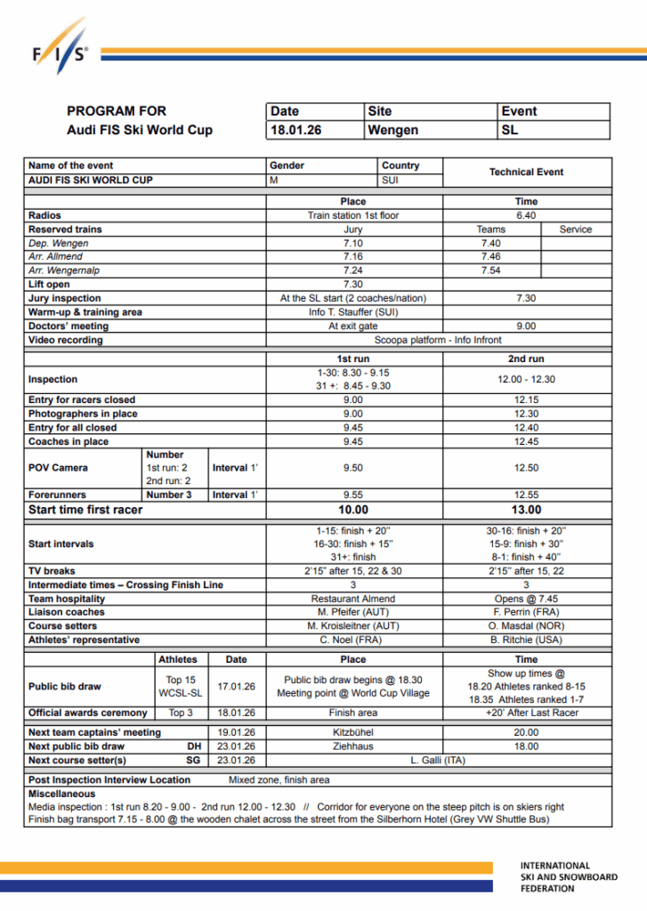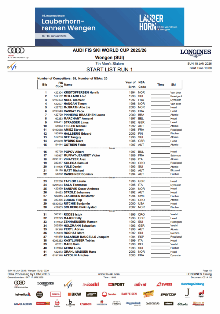 In clear sky situations, daylight at Wengen typically improves visible distinction later within the first run begin order, serving to athletes learn terrain, rolls, and rhythm adjustments extra clearly. On a slope this complicated, imaginative and prescient may be decisive. With situations up to now wonderful, visibility might once more affect how the race unfolds for the upper bibs.