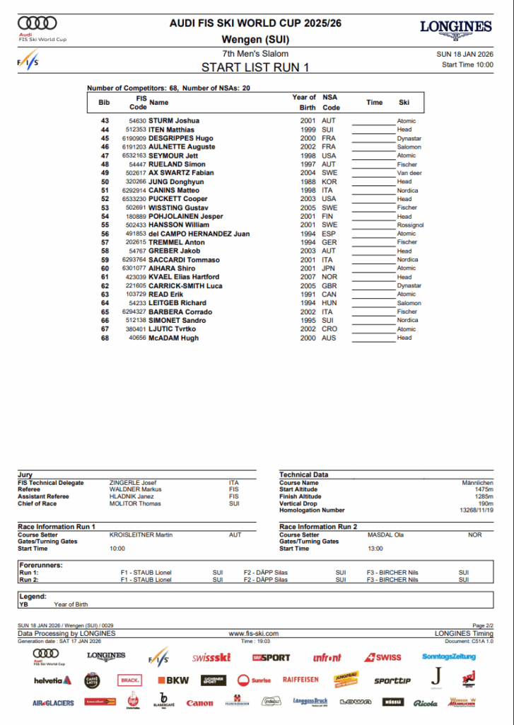 Sunday’s race can also be the seventh of 9 slaloms earlier than the Olympic break and the ultimate alternative for U.S. males to qualify on standards for the Milano-Cortina 2026 Olympic workforce. After Wengen, the dialogue turns to restricted discretionary spots, with the U.S. holding treasured few quotas and the chance of shedding one other earlier than workforce naming.